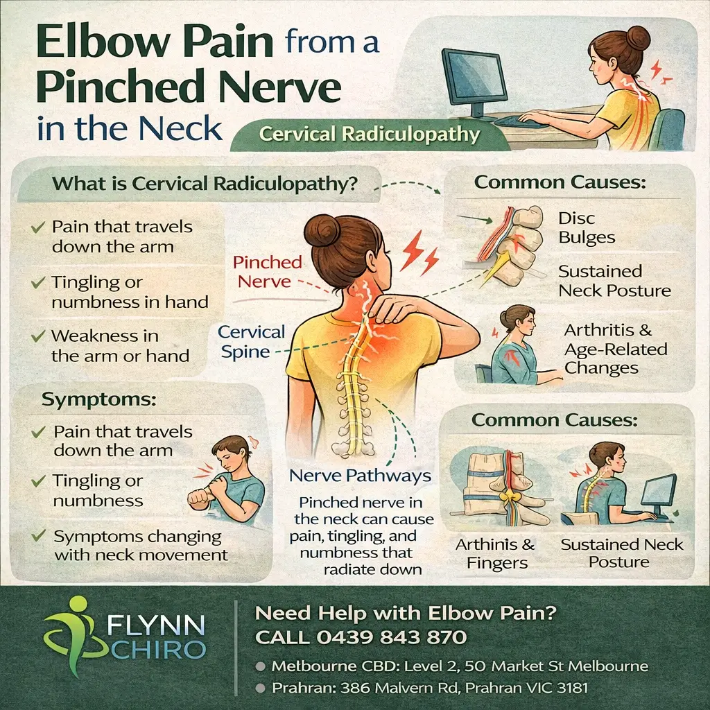 For people working long hours at desks in Melbourne CBD or commuting daily from suburbs like Prahran, this type of neck-related arm pain can easily be mistaken for an elbow injury.